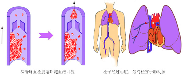 下肢深静脉血栓的急性期并发症,血栓在腿部形成后,如果发生破碎,从下肢静脉脱落下来成为栓子,顺着静脉血流回流到心脏,这些栓子并不会止步于心脏,而是被心脏排入肺动脉,形成肺栓塞,也称肺梗。
