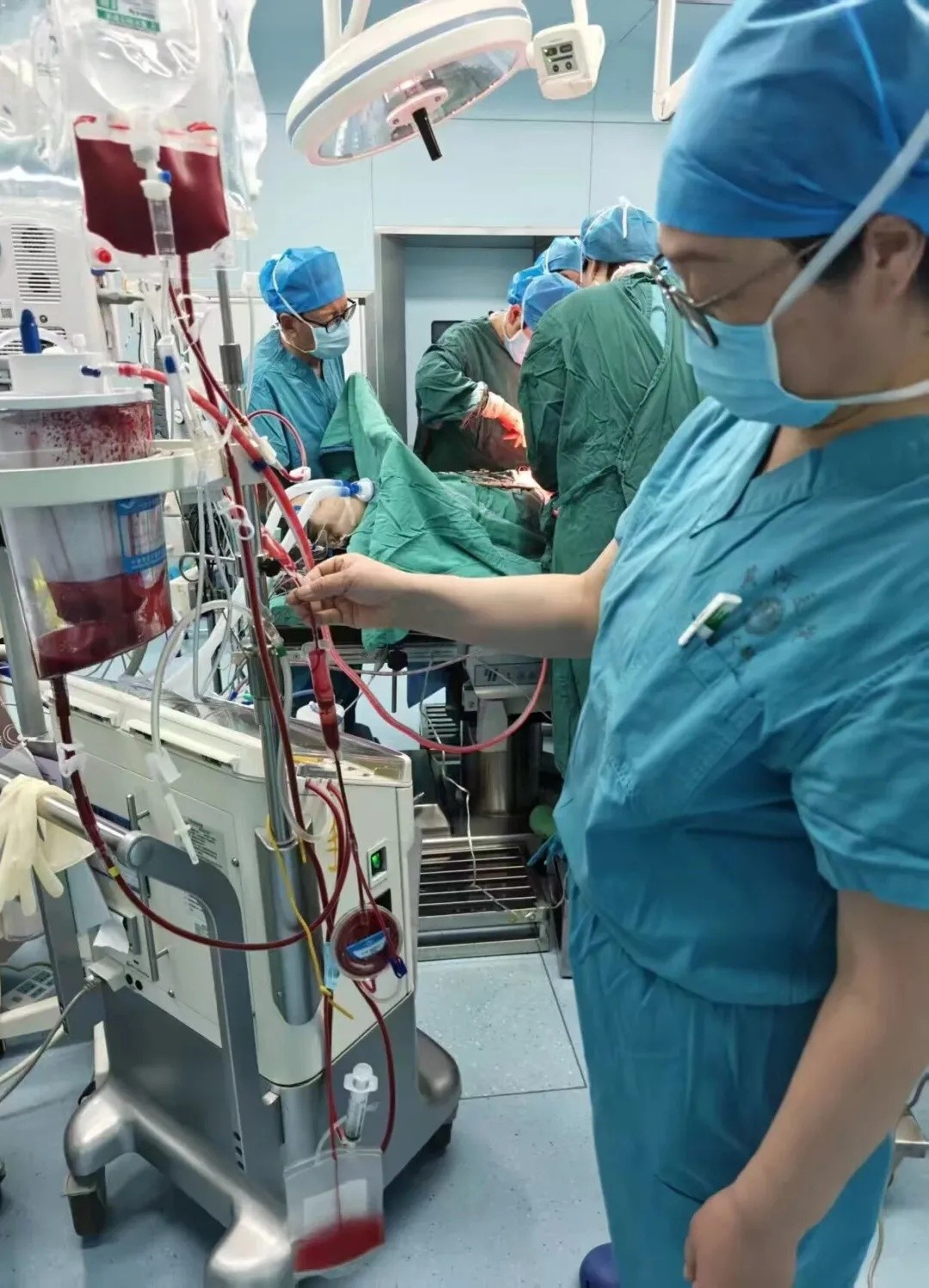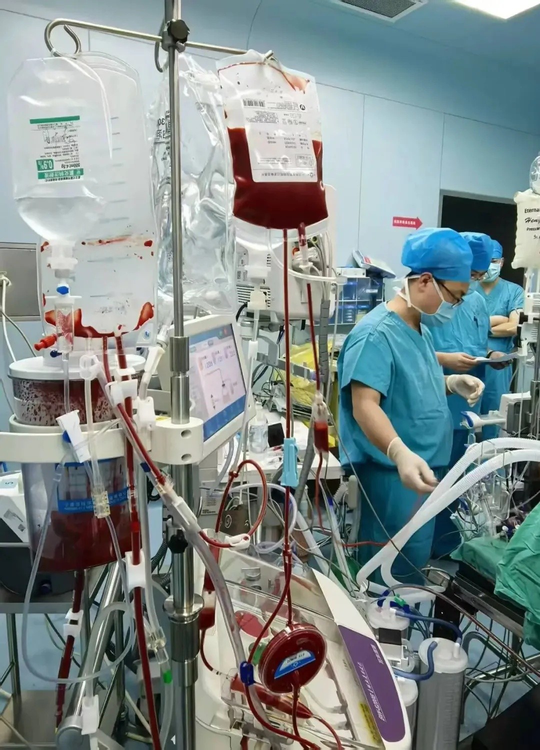 与此同时,麻醉医生迅速开启血液回收机,启动自体血回输。将手术野流出的血液收集、洗涤、浓缩成宝贵的红细胞,再用白细胞滤器对回收的血液进一步过滤,去除可能混有的羊水、胎脂等成分后,安全回输给产妇。同时,使用血管活性药物和输注部分异体血维持产妇生命体征平稳。